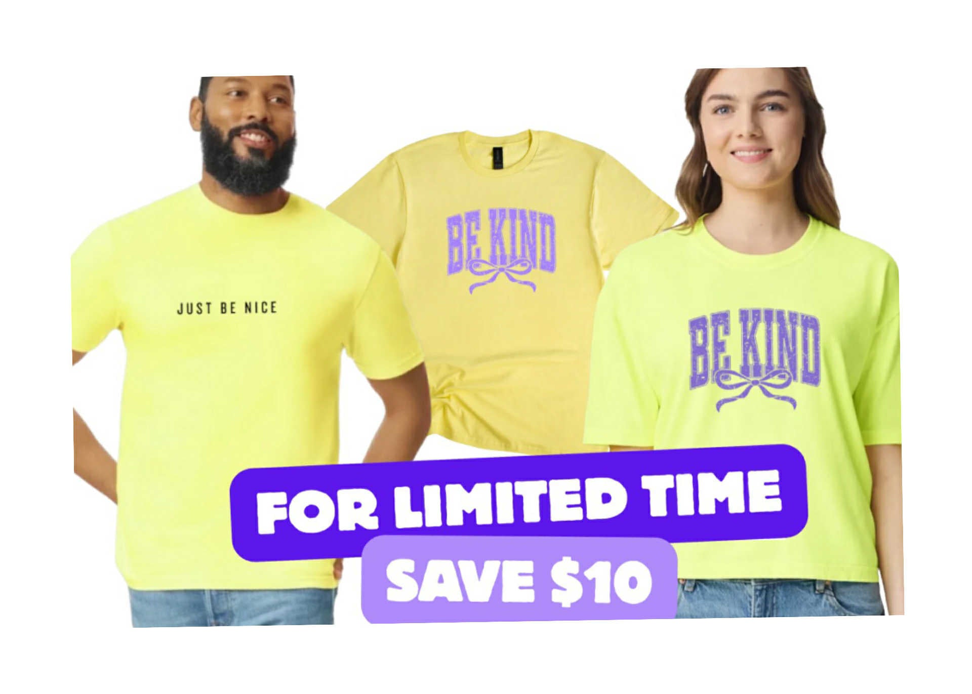 Double up & save! Grab a Be Kind tee with anything else and we'll knock $10 off your order. Use Promo Code BEKIND